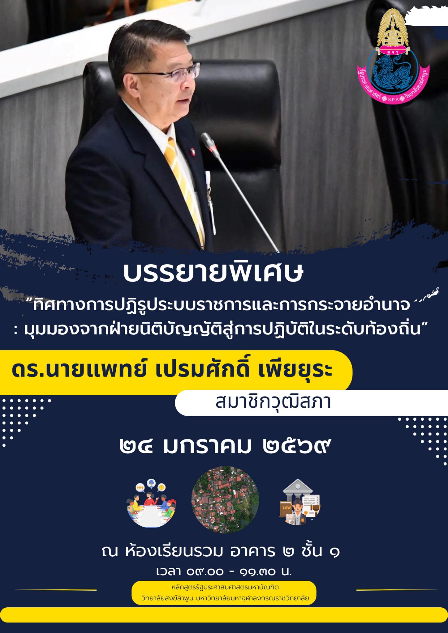 บรรยายพิเศษโดย ดร.นพ.เปรมศักดิ์ เพียยุระ / ข่าวกิจกรรม / By วิทยาลัยสงฆ์ลำพูน #บูรณาการกับการเรียนการสอน#หลักสูตรรัฐประศาสนศาสตรมหาบัณฑิตวันเสาร์ที่24 ม.ค.69 บรรยายพิเศษโดย ดร.นพ.เปรมศักดิ์ เพียยุระ อดีตนายกเทศมนตรีเมืองบ้านไผ่ จ.ขอนแก่น อดีตสมาชิกสภาผู้แทนราษฎร จ.ขอนแก่น อดีตที่ปรึกษารัฐมนตรีว่าการกระทรวงมหาดไทย และกระทรวงแรงงานและสวัสดิการสังคม ในรัฐบาลพล.อ. ชวลิต ยงใจยุทธ ปัจจุบันเป็น สว. มีผลงานที่โดดเด่นในการผลักดันงานด้านสาธารณสุขและงานพัฒนาท้องถิ่น ที่ห้องเรียนอัจฉริยะอาคาร ๒ ชั้น ๑ ในหัวข้อบรรยายพิเศษเรื่อง”ทิศทางการปฏิรูประบบราชการและการกระจายอำนาจ: มุมมองจากฝ่ายนิติบัญญัติสู่การปฏิบัติในระดับท้องถิ่น”